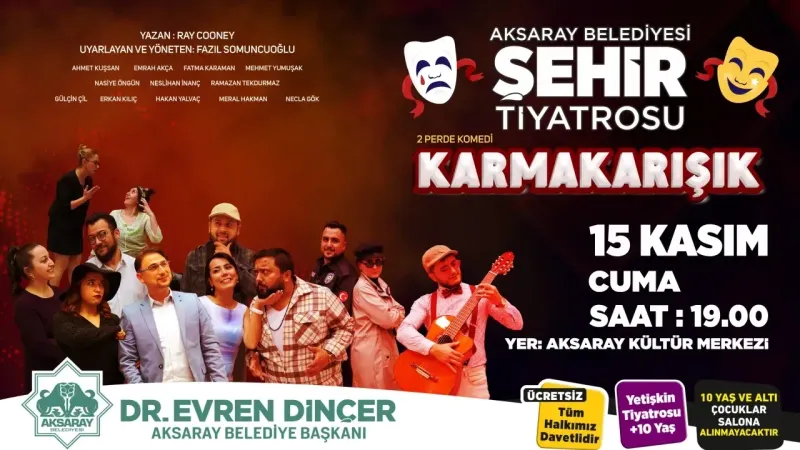 Aksaray Belediyesi, kültür ve sanat alanındaki etkinliklerine bir yenisini daha ekleyerek, şehri sanatla buluşturuyor. Aksaray Belediyesi Tiyatro Topluluğu, kursiyerlerinin hazırladığı 2 Perde Komedi "KARMARIKIŞIK" adlı tiyatro oyununu 15 Kasım Cuma günü saat 19:00’da Aksaray Kültür Merkezi'nde sahneleyecek. Şehirdeki sanatsal gelişimi desteklemek amacıyla düzenlenen bu etkinlik, izleyicilere eğlenceli ve keyifli bir akşam sunmayı vaat ediyor.
