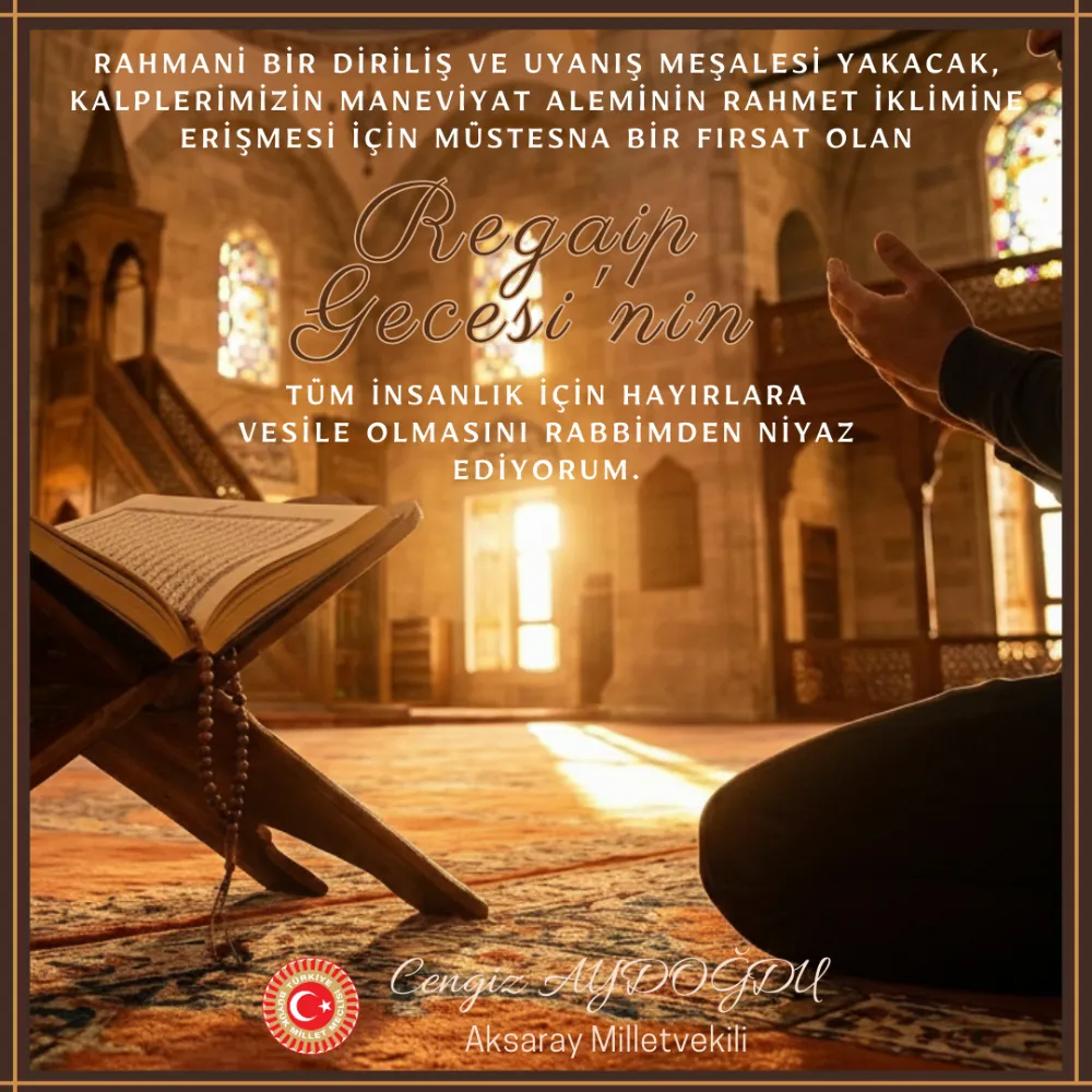 Regaip Gecesi’nin, bireyin iç dünyasında ve toplum hayatında taze bir başlangıca kapı araladığı ifade edildi. Manevi arınma ve iç muhasebe için önemli bir fırsat sunduğu vurgulandı.