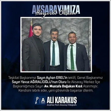 Anahtar Parti Aksaray Merkez İlçe Başkanlığına Teşkilat Başkanı Ayhan Erel’in teklifi Genel Başkan Yavuz Ağıralioğlu’nun Olurlarıyla Avukat Mustafa Doğukan Kızıl'ı atadı.