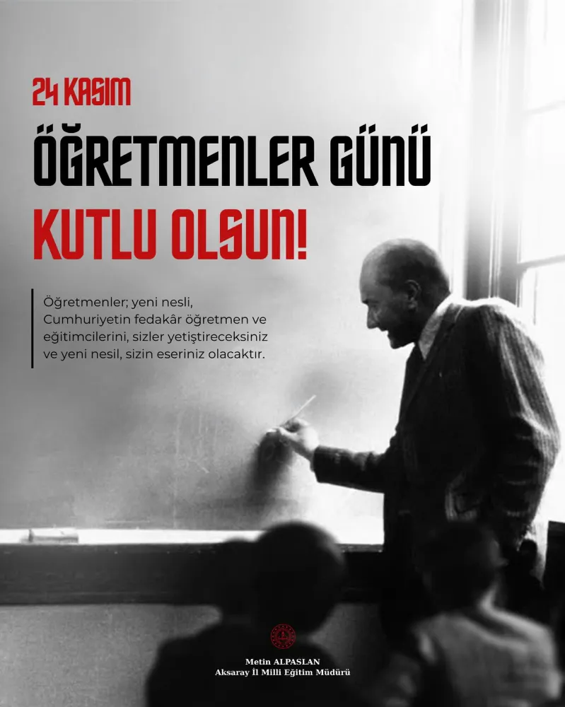 Aksaray İl Millî Eğitim Müdürü Metin Alpaslan, 24 Kasım Öğretmenler Günü dolayısıyla yayımladığı mesajda öğretmenliğin kutsal görevine vurgu yaptı. Alpaslan, öğretmenlerin yalnızca bilgi veren değil, bir nesli inşa eden mimarlar olduğunu ifade etti.
