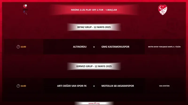 Motolux 68 Aksarayspor ile Artı Değer Vanspor FK arasındaki ilk maç 12 Mayıs Pazartesi günü saat 16.00’da Van Atatürk Stadyumu’nda oynanacak. Rövanş karşılaşması ise 16 Mayıs Cuma günü aynı saatte Aksaray Dağılgan Stadyumu’nda gerçekleştirilecek.