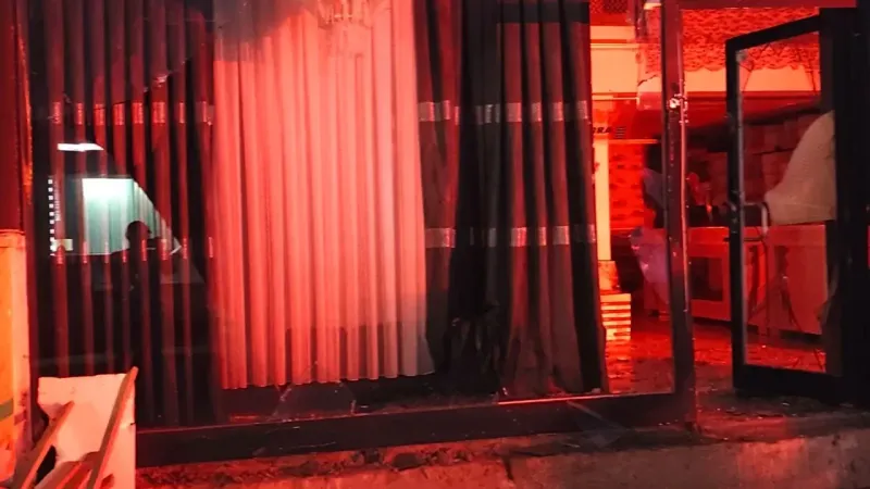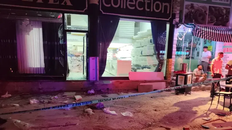 Motosiklet kamyonete çarptıktan sonra savrularak bir iş yeri önüne kadar sürüklendi. Sürücü Mert U. ve arkasında bulunan yolcu Mert Ö., motosikletten fırlayarak iş yerinin camlarını kırıp kaldırıma savruldu.