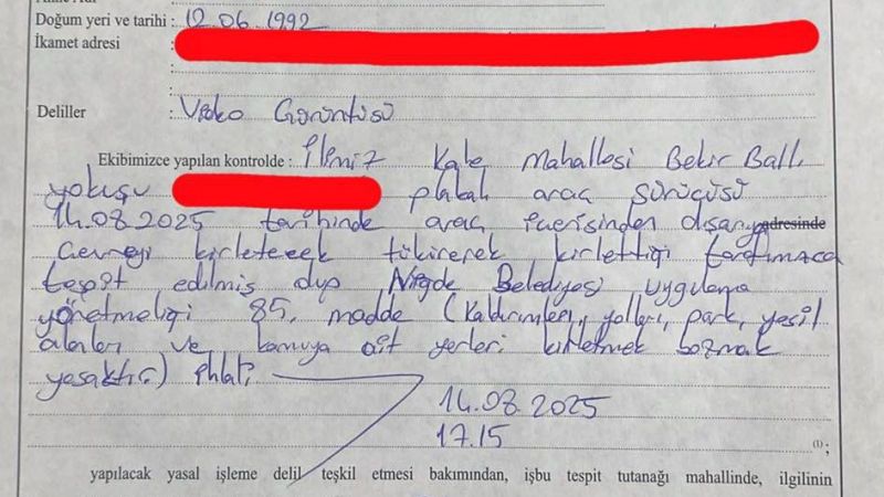 Niğde'nin Kale Mahallesi Bekir Ballı Yokuşu’nda zabıta ekiplerinin yaptığı denetimlerde, araçtan yere tüküren bir kişi kamera görüntüleriyle tespit edildi. Emir ve Yasaklar Yönetmeliği'nin 85. maddesi kapsamında cezai işlem uygulanarak 2.953 TL para cezası kesildi.