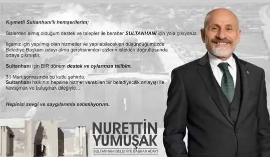 31 Mart yerel seçimler yaklaşırken aday adayları da farklı partilerde şimdilik tekleme de olsa meydana çıktıkları gözleniyor. Belediye Başkanlığında en heyecanlı ve çekişmeli seçimlerin kasabalar ve ilçelerde olması bekleniyor. Şehrimiz iş insanlarından Yeni Aksaray otobüs işletmesi sahiplerinden, Ak parti yönetim kadrolarında bulunan Nurettin Yumuşak memleketi Sultanhanı ilçesinden Belediye Başkanlığı için aday adaylığını açıkladı. Sosyal medya hesabından hemşehrilerine seslenen Yumuşak şunları söyledi : “Sizlerden almış olduğum destek ve talepler de beraber Sultanhanı için yola çıkıyoruz.