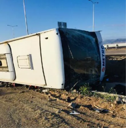 Edinilen bilgiye göre kaza sabah saatlerinde Niğde- Ankara otobanı Gülağaç ilçesi Gülpınar beldesi yakınlarında meydana geldi. Adana'dan Ankara'ya giden Uğur Öztürk (42) yönetimindeki Metro Turizm firmasına ait boş yolcu otobüsü, sol ön lastiğinin patlayıp, yerinden fırlamasıyla şarampole devrildi. Kazada şoför Uğur Öztürk, otobüs personeli Murat İnce (53) ve Muhyettin Yağız (40) yaralandı. Olayı gören vatandaşlar 112 Acil Yardım Servisine haber verdi. İhbar üzerine kaza yerine sağlık ve polis ekipleri sevk edildi. Sağlık görevlilerinin ilk müdahalesini yaptığı 3 yaralı, ambulanslarla AksarayEğitim ve Araştırma Hastanesi'ne kaldırıldı. Olayla ilgili açıklamada bulunan Uğur Öztürk, 'Lastik patladı ve bir anda neye uğradığımı şaşırdım. Aracın ön kısmından ses geldi ve araç dengeyi kaybederek, şarampole devrildik' dedi. Yaralı muavin Muhyettin Yağız ise şu ifadelerde bulundu; 'Aracın sol ön tekeri yerinden çıktı. Şoför, aracı toparlamaya çalıştı. Kaza olmadan önce şoför, su istedi, ona su verdim. O sırada sol lastikten ses geldi. Sürücü aracı toparlayamadı ve bariyere çarparak yan yattı. Eğer otobüs diğer tarafa devrilseydi TIR bizi biçerdi' Haber/Foto: Birsen İN