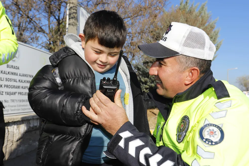 Denetim sırasında görevli trafik polisi Cumali Kandemir, 10 yaşındaki özel öğrenci Hamza Demirel'e polis şapkasını takarak küçük çocuğun hayaline dokundu. Şapkayı gururla takan Hamza, eline verilen telsizle anons da yaptı. O anlar, hem görevliler hem de izleyenler için unutulmaz bir anıya dönüştü.