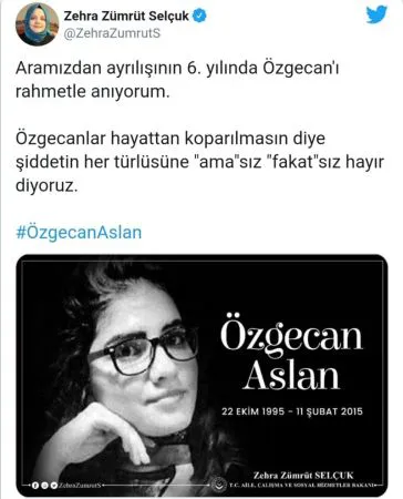 Özgecan Aslan’ın katledilişinin 6’ncı yılında da unutulmadı. Mersin’in Tarsus ilçesinde, 11 Şubat 2015 tarihinde okuldan çıktıktan sonra evine gitmek için bindiği minibüste öldürülen ve kadına yönelik şiddetin simgesi haline gelen Özgecan Aslan katledilişinin 6'ıncı yıl dönümünde anıldı. Öldüldüğünde 19 yaşında olan, Mersin Çağ Üniversi’nde psikoloji bölümünde eğitim gören Aslan'ı Türkiye unutmadı. 1 Şubat 2015'te bindiği minibüs şoförü tarafından önce tecavüze uğrayan sonrasında yakılarak öldürülen Özgecan Aslan için ölümünün 6’ncı yılında açılan #ÖzgecanAslan etiketini kadın teşkilatları, vatandaşlar ve siyasetçiler de paylaşımda bulundu.
