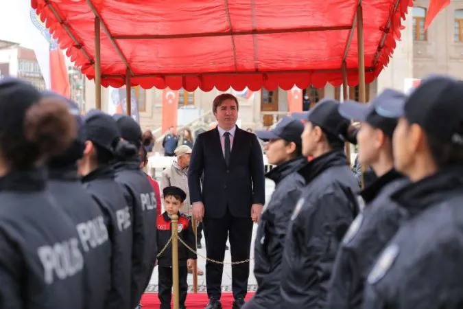 Geçit töreni yapan emniyet güçlerini polis elbisesi giyen çocuklar ile birlikte selamlayan Vali