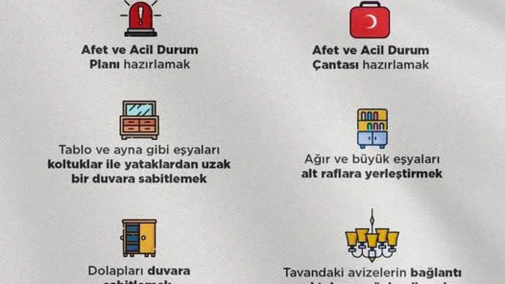 Hem evlerde hem de iş yerlerinde bir “acil durum çantası” hazırlanmalı, bu çantada su, konserve yiyecek, el feneri, pil, düdük, temel ilaçlar ve önemli belgelerin fotokopileri yer almalıdır. Bu çanta, kolay ulaşılabilecek bir noktada muhafaza edilmelidir.