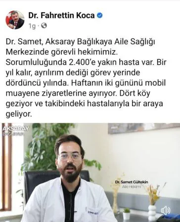 Aksaray’da görev yapan bir doktorun haftanın iki gününü mobil hizmete ayırarak köylere gittiği anların videosunu paylaşan Sağlık Bakanı Dr. Fahrettin Koca sosyal medya hesabından yaptığı paylaşımda, “Doktor Samet Aksaray Bağlıkaya Aile Sağlık Merkezi’nde görevli hekimimiz. Sorumluluğunda 2 bin 400’e yakın hasta var. ‘Bir yıl kalır ayrılırım’ dediği görev yerinde dördüncü yılında. Haftanın iki gününü mobil muayene hizmetlerini ziyaretlerine ayırıyor. 4 köy geziyor ve takibindeki hastalarıyla bir araya geliyor.” dedi.