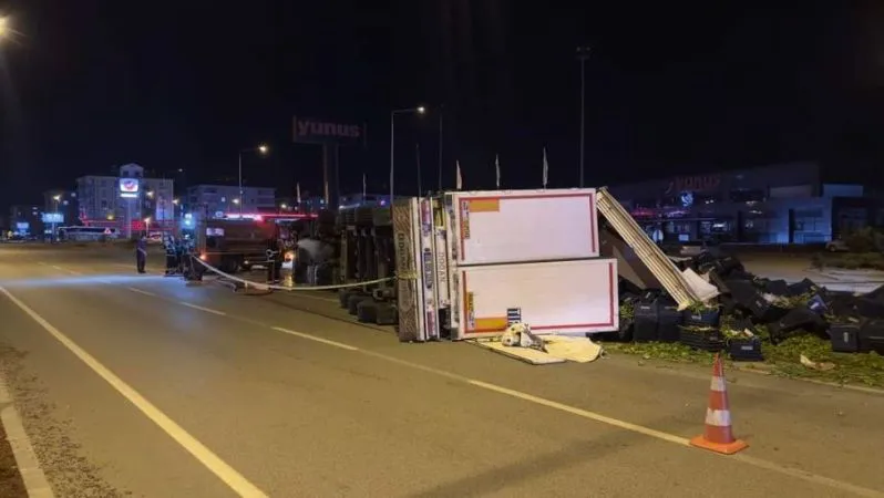 Sebze meyve yüklü tır devrildi, şoför yaralı.