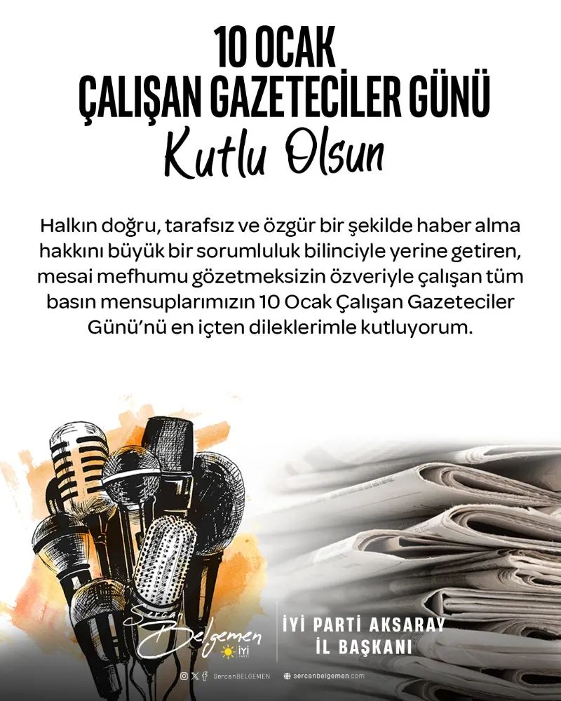 İYİ Parti Aksaray İl Başkanı Sercan Belgemen, 10 Ocak Çalışan Gazeteciler Günü dolayısıyla yayımladığı mesajda, halkın haber alma hakkını sağlayan basın emekçilerine teşekkür etti. Belgemen, gazetecilerin büyük bir sorumlulukla görev yaptığını vurguladı.