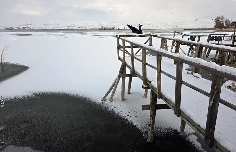 Sakarmeke kuşları ise gölün donmayan kısmında yiyecek aramaya devam etti. Soğuk hava koşullarına rağmen, gölün belirli bölümleri bu kuşlar için yaşam alanı olmaya devam ediyor.