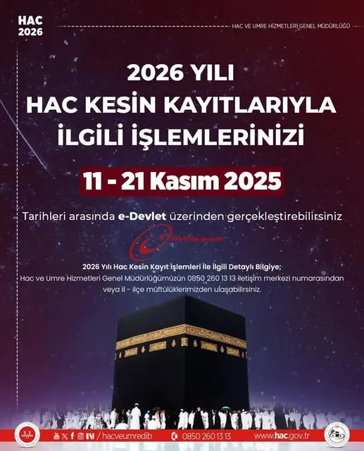 Diyanet İşleri Başkanlığı Hac ve Umre Hizmetleri Genel Müdürlüğü’nün açıklamasına göre, hac kesin kayıt işlemleri sadece e-Devlet kapısı üzerinden gerçekleştirilecek. Vatandaşların işlemlerini belirtilen tarihler arasında eksiksiz tamamlaması gerekiyor.