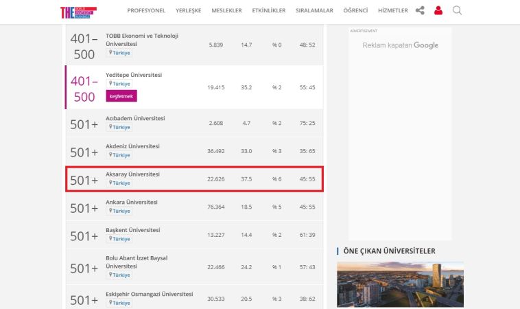 Times Higher Education (THE), Financial Times Stock Exchange (FTSE) endeksine göre ülkeleri “Gelişmiş,” “Yükselen,” “İkinci Derece Yükselen” ve “Sınırda” kategorilerine göre değerlendiriyor ve bu ülkelerdeki üniversiteleri beş ana başlık ve 13 gösterge üzerinden sıralıyor. Bu yıl listeye dünya genelinde -içerisinde Türkiye’nin de olduğu- 48 ülke ve bu ülkelerde bulunan toplam 606 üniversite girebildi. Listede yer alan 43 Türk üniversitesi arasında ASÜ de var. THE’nin, üniversiteleri “Eğitim,” “Araştırma,” “Atıf,” “Uluslararası Görünüm” ve “Sanayi Gelirleri” olarak belirlenen beş ana başlık ve bunlara bağlı 13 göstergeye göre sıraladığını kaydeden Rektör Şahin, “İlgili sıralamada ‘Uluslararası Görünüm’ ve ‘Sanayi Gelirleri’ başlıkları ağırlıklı bir noktada. Üniversitemiz bu listede 501+ aralığında yer almış ve son derece kıymetli bir başarı elde etmiştir. Yaptıkları çalışmalarla Üniversitemizin listede yer almasına katkı sağlayan, bu noktada emek veren tüm arkadaşlarımıza teşekkür ediyoruz” dedi.