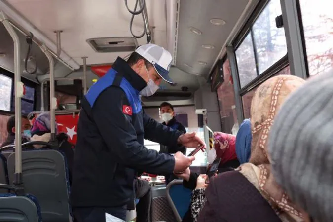 yolcu taşıması için Belediye ekiplerince uyarıldı. Sürücülere ve yolculara tedbirli olmaları ve maske, mesafe, hijyen kurallarına riayet etmeleri konusunda uyarılarda bunarak HES kodu kullanımının zorunlu olduğu hatırlatılıyor.