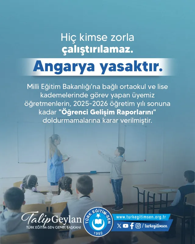 Türk Eğitim Sendikası, öğretmenlerin üzerindeki angarya iş yükünü kaldırmak ve hukuka aykırı uygulamayı sonlandırmak amacıyla önemli bir karar aldı. Sendika, Milli Eğitim Bakanlığı’na bağlı ortaokul ve lise kademelerinde görev yapan üye öğretmenlerin, 2025-2026 öğretim yılı sonuna kadar ‘Öğrenci Gelişim Raporlarını’ doldurmamalarına karar verdiğini açıkladı.