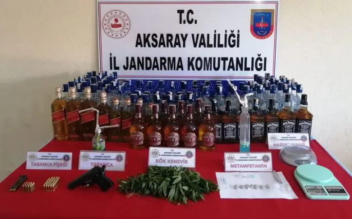 Aksaray İl Jandarma Komutanlığı sorumluluk bölgesinde, uyuşturucu ve uyarıcı madde imal ve ticareti, kullanmak için uyuşturucu satın almak/kabul etmek/bulundurmak, 2313 sayılı Uyuşturucu Maddelerin Murakabesi Hakkındaki Kanuna Muhalefet (Yasadışı Kenevir Ekimi), 4733 sayılı Tütün, Tütün Mamulleri ve Alkol Piyasasının Düzenlenmesine Dair Kanuna Muhalefet suçlarınınönlenmesi ve şüphelilerin yakalanarak kanun önüne çıkartılması konusundaki kapsamlı çalışmalarına devam ediyor. Konu ile ilgili yapılan istihbari çalışmalar neticesinde, Güzelyurt ilçesi Ihlara beldesi mülki sınırları içerisinde şüpheli şahısların işletmiş oldukları markette uyuşturucu madde ve kaçak alkol sattıkları yönünde alınan haberin değerlendirilmesi üzerine, şahısların suç ve suç unsuru malzeme ile birlikte yakalanmasınayönelik, Cumhuriyet Başsavcılığı koordinesinde, 14 Eylül 2021 tarihinde icra edilen canlı takipler neticesinde M.K. ve Ş.K isimli şüpheliler suçüstü yakalandılar. Şüphelilerinüzerlerinde, evlerinde ve işletmiş oldukları markette yapılan aramalarda; 25 gr metamfetamin, 30 kök kenevir, 2 adet hassas terazi, 140 litre kaçak alkol, 1 adet tabanca, 2 adet şarjör, 59 adet tabanca fişeği, bir miktar kenevir tohumu ve 16 adet uyuşturucu madde kullanma aparatı ele geçirildi. İki şahıs göz altına alınırken olayla ilgili soruşturma sürüyor.