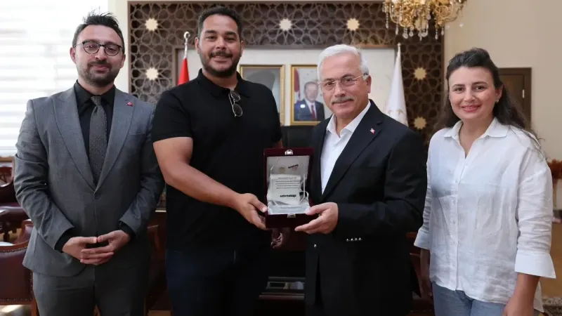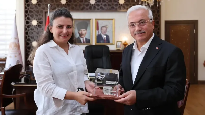 Aksaray Valisi Mehmet Ali Kumbuzoğlu, Eskil Tuz Gölü Maratonu “Runfire Salt Lake Trail” uzun etap organizasyon ekibinden Ecem Eroğlu İnan ve Doğu Karakoç’u makamında misafir etti.